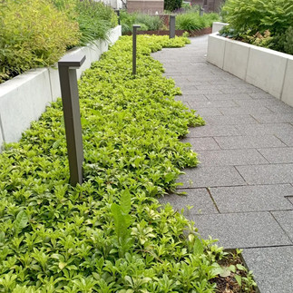 Teraz roślinność: jest na bogato! Ale nie jak w sklepie "wszystko za 5 zł", tylko z głową. W założeniach projektowych jest punkt o jak najbogatszym układzie roślinnym. I to się udało. Są tu i drzewa (! kotwione specjalnym systemem do zielonych dachów), i krzewy, i bogaty dobór bylin. Znalazł się tu: platan, świdośliwa, jodła, świerk, sosna, dereń, hortensja, różanecznik, bez czarny, tawlina, tawuła, liliowiec, funkia, lawenda, kocimiętka, runianka, szałwia, turzyca, rozplenica, powojnik, bluszcz, hortensja pnąca, czosnek, tawułka, ostróżka, piwonia, odętka, ostnica i parę innych. Z odmian podam tylko funkie: 'Blue Cadet' i 'Patriot', bo ich są dziesiątki. Moją uwagę zwróciła runianka japońska/pachysandra terminalis w odmianie 'Greencarpet' pięknie wychodząca na ścieżkę (foto). I choć znalazłam się tam zupełnie przypadkiem, w drodze do apteki i bez związku z ogrodnictwem czy projektowaniem, to wciągnęło mnie w głąb ogródka... Nasadzenia muszą być w miarę nowe, bo projekt Katarzyny Molskiej jest z 2020 r. Teraz, skoro już odkryłam to miejsce, będę tam od czasu do czasu wpadać i sprawdzać jak się to wszystko rozwija.